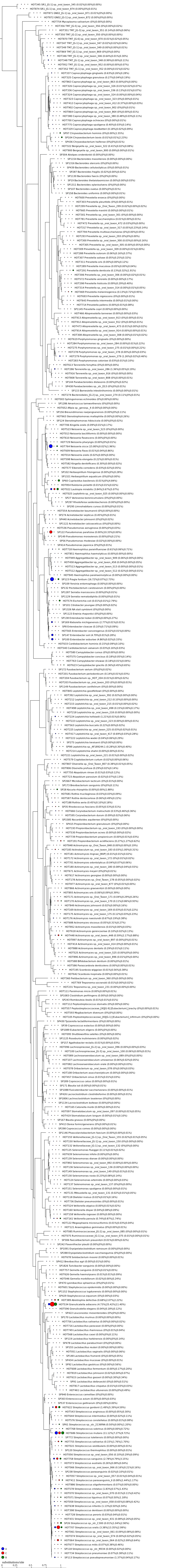 Percent Read Abundance Plot on Phylogenetic Tree (Reads assigned to unique species only) |